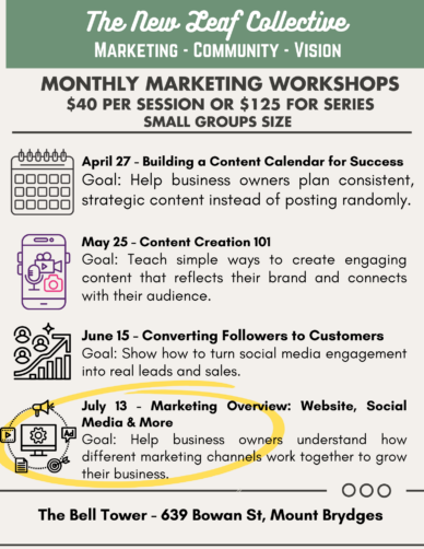 Join Ashley Rowe founder of The New Leaf Collective for four engaging and informative workshops to help build upon existing systems, grow your business on social media, and manage your […]