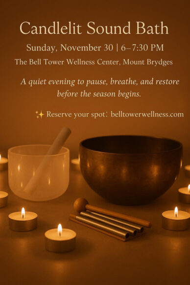 Bell Tower 639 Bowan Street, Mount Brydges, ON, CanadaSunday, November 30 | 6-7:30 PM Join Michele in a special candle lit sound bath. Bathe in candlelight and sound as you take a pause before the busyness of the holiday season. Let soothing tones of crystal bowls, drum, chimes, and voice guide you into deep rest and renewal. An evening to soften, breathe, and […]